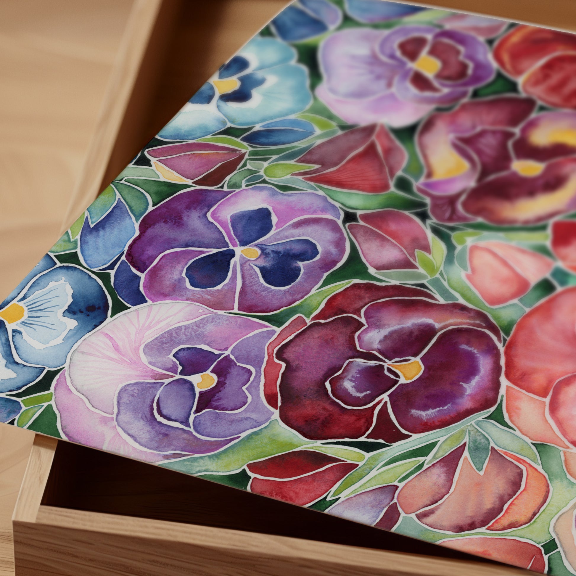 Ombre Pansies is a botanical watercolor giclée art print inspired by the vibrant colors and striking form of pansy blossoms. Bold washes of layered color and expressive brushwork highlight the energetic shapes of these garden blooms, creating a floral piece with visual impact.